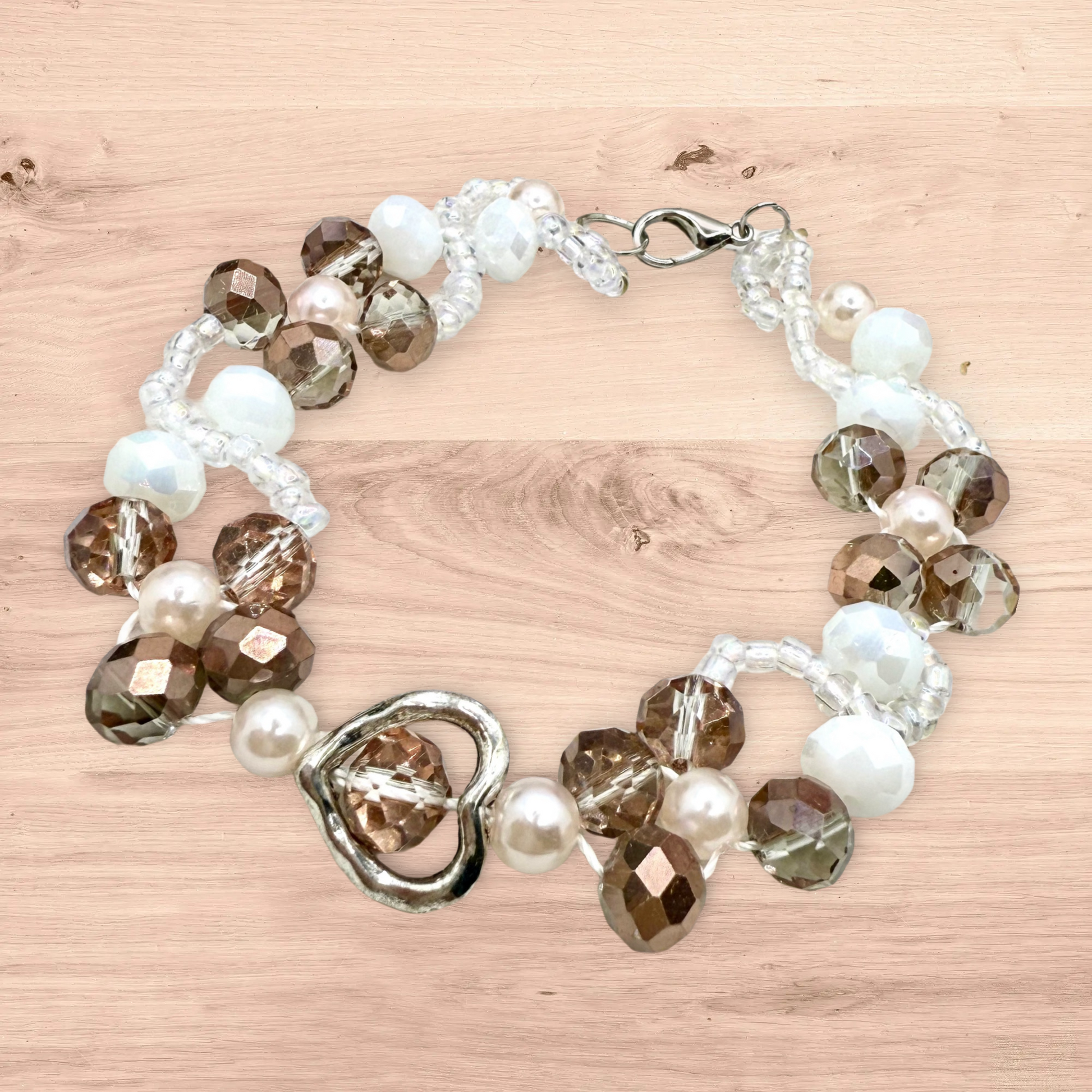 Champagne in white glass beads with hollow heart charms