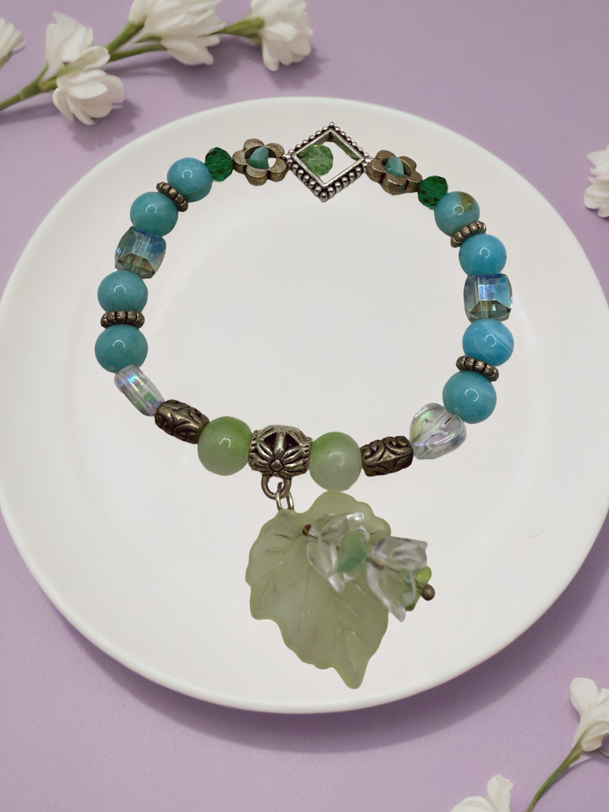 This turquoise flower and leaf charms beaded bracelet combines natural-inspired design with elegant craftsmanship. Featuring vibrant turquoise beads accented by delicate flower and leaf charms, it offers a harmonious blend of color and texture. Perfect for adding a refined, nature-themed touch to your ensemble, this bracelet enhances versatility while maintaining a polished appearance suitable for both casual and formal occasions.